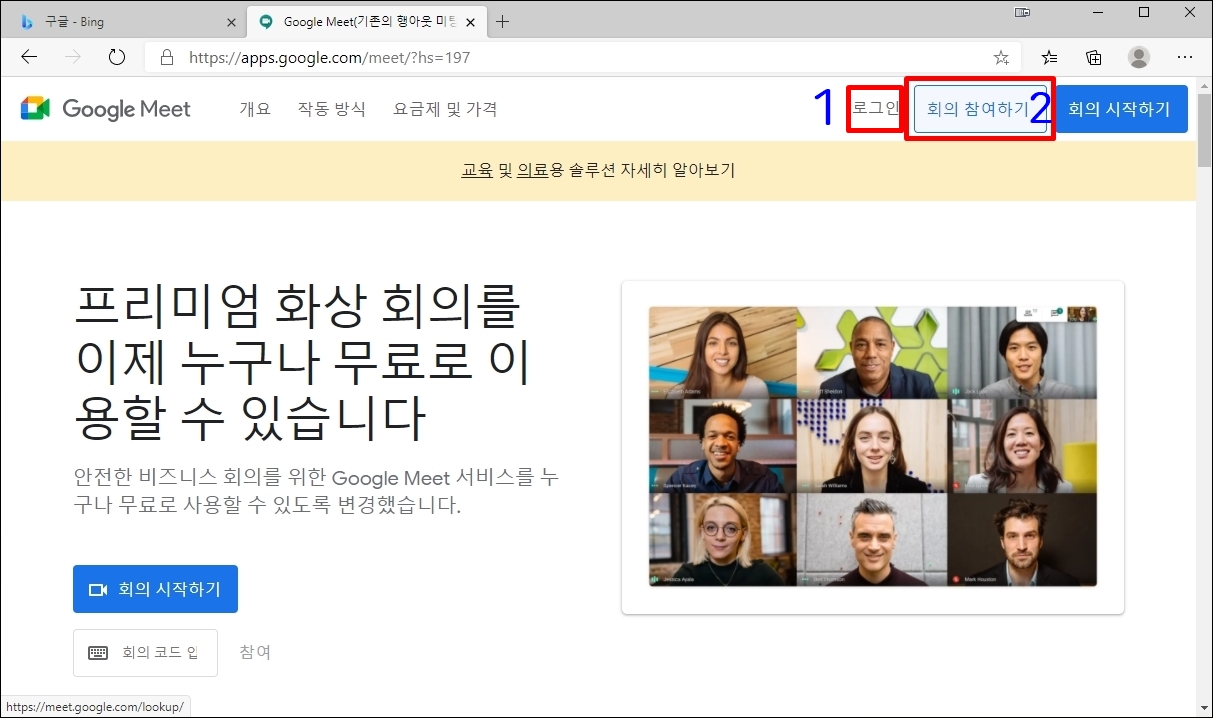 ① 인터넷 창을 열고 주소창에 www.google.co.kr 을 입력하여 구글 첫 화면으로 이동합니다. <로그인> 옆 바둑판 모양을 클릭하면 <Meet>가 나옵니다. Meet를 클릭하시면 됩니다.