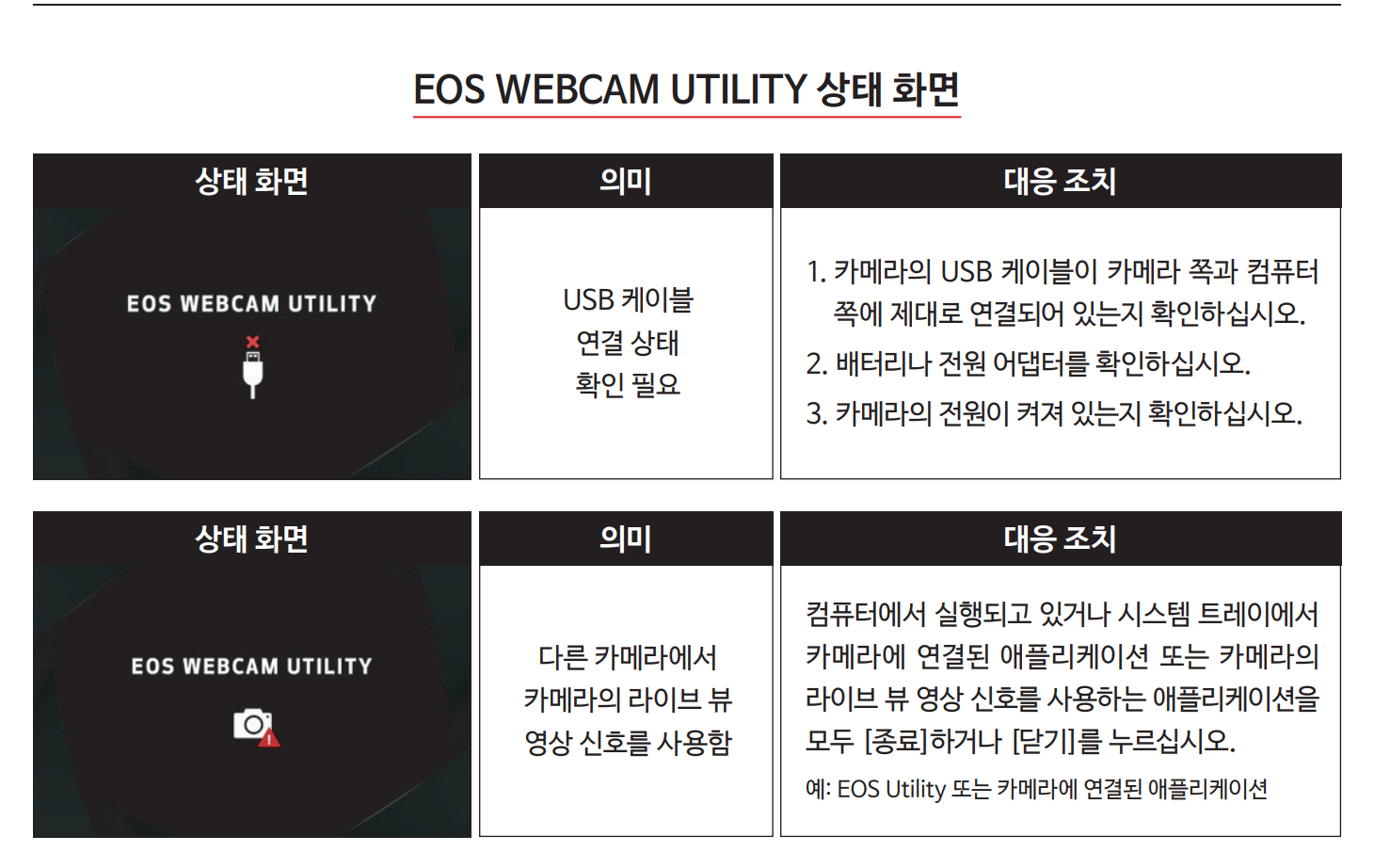 아래는 캐논 공식 사이트에 나오는 에러 메시지 화면입니다. 카메라 연결이 잘못되면 아래와 같은 화면이 나오게 되는데 USB연결 상태를 확인하시거나 혹은 입력되는 카메라를 캐논으로 변경해주시면 된다는 안내입니다.