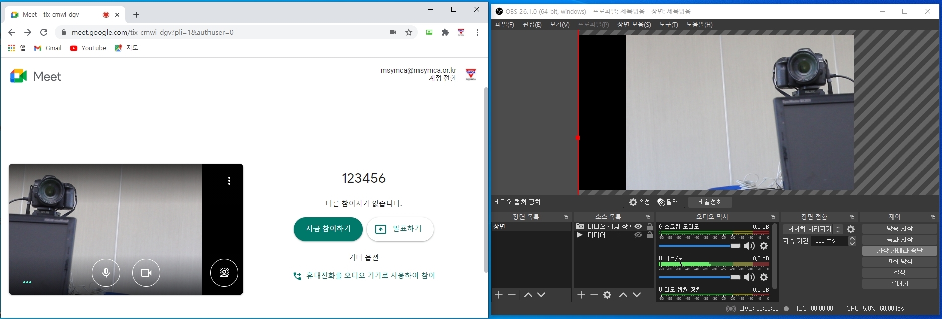 위 사진도 구글 Meet에서 OBS 영상을 외부 카메라처럼 인식하여 불러 온 것입니다. OBS는 캐논 80D DSLR 카메라를 웹캠처럼 불러들인 것이구요. 예컨대 최종적으로 구글 Meet에서 송출 되는 영상은 캐논 80D로 들어 온 영상을 OBS를 거쳐 구글 Meet로 들어온 것입니다.