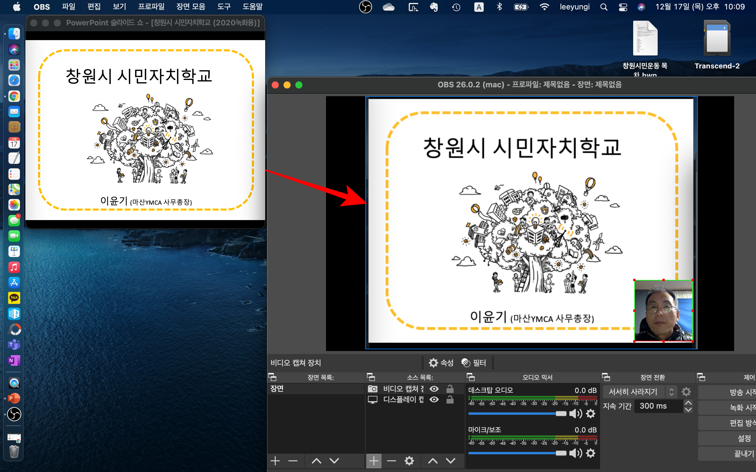 또 OBS를 활용하면 컴퓨터 화면에 나오는 영상들을 송출할 수 있기 때문에 PPT 발표 자료와 실시간 영상을 합쳐서 송출하는 것도 어렵지 않습니다. 위 사진은 화면에 띄워 놓은 PPT 화면을 OBS로 불러오고 맥북 웹캠 영상을 OBS로 불러 온 후에 얼굴만 작게 보이도록 화면을 줄인 것입니다.