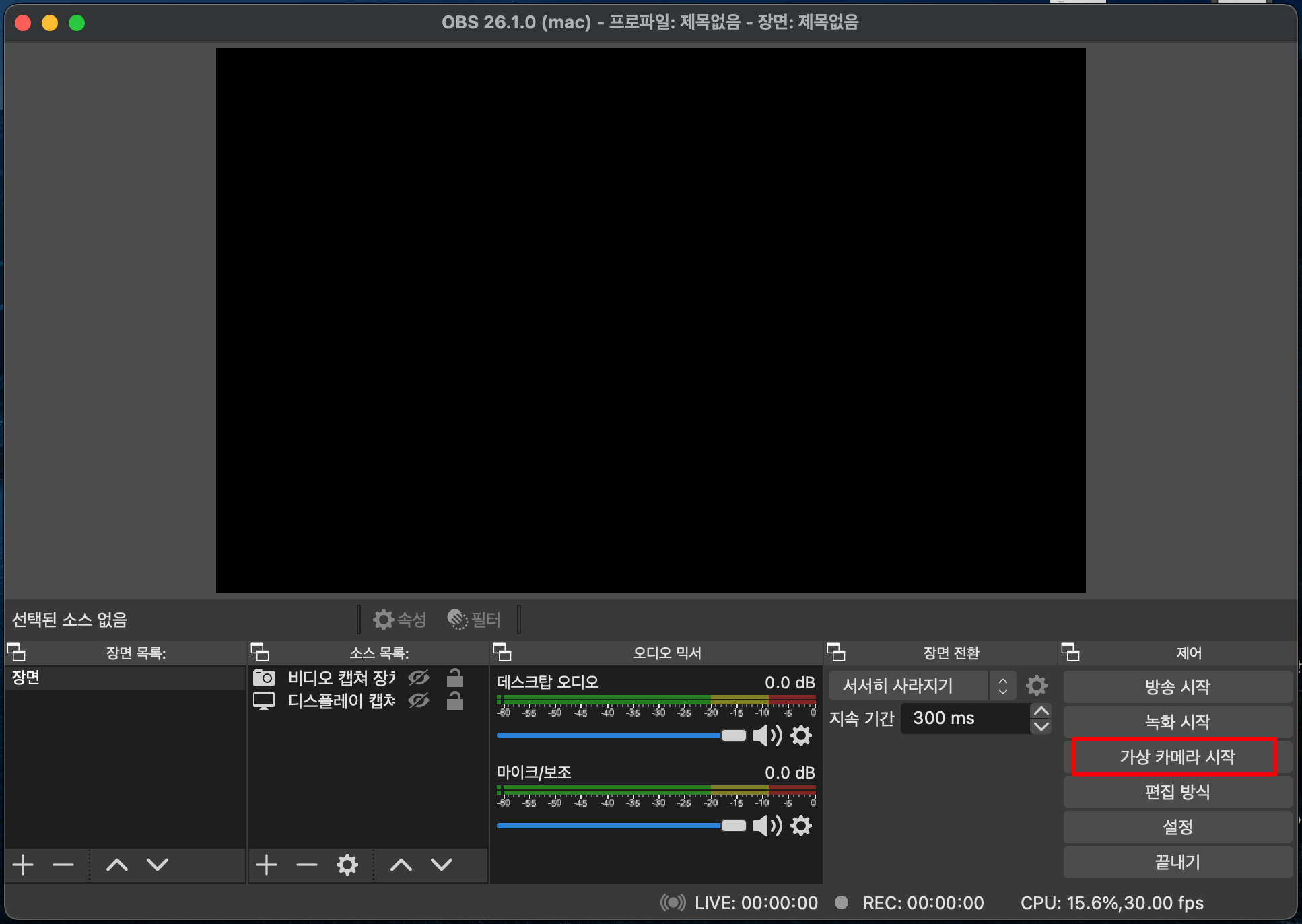 윈도우용 OBS는 진작부터 이 기능이 있었습니다. 제가 처음 OBS를 설치했더니 맥에는 없고 윈도우에만 있는 메뉴가 한 가지 있더군요. 바로 아래 사진에 빨간 박스 표시를 해놓은 <가상 카메라 시작> 버튼입니다.