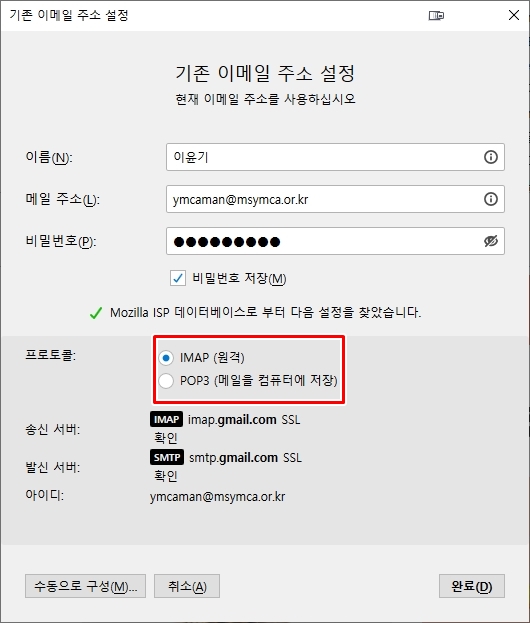IMAP는 스마트폰 메일 설정처럼 내 컴퓨터에 메일을 다운받지 않고 서버와 연결하여 메일을 받고 보내는 방식입니다. 두 가지 방식은 각각의 장단점이 있습니다. (저의 경우 메인으로 사용하는 데스크탑은 POP3 방식으로 설정하고, 노트북을 비롯한 다른 기기들은 IMAP 방식으로 설정하였습니다. 이렇게 하면 스마트폰이나 노트북에서 보낸 메일도 메인으로 사용하는 데스크탑에서 다 확인할 수 있기 때문입니다.)