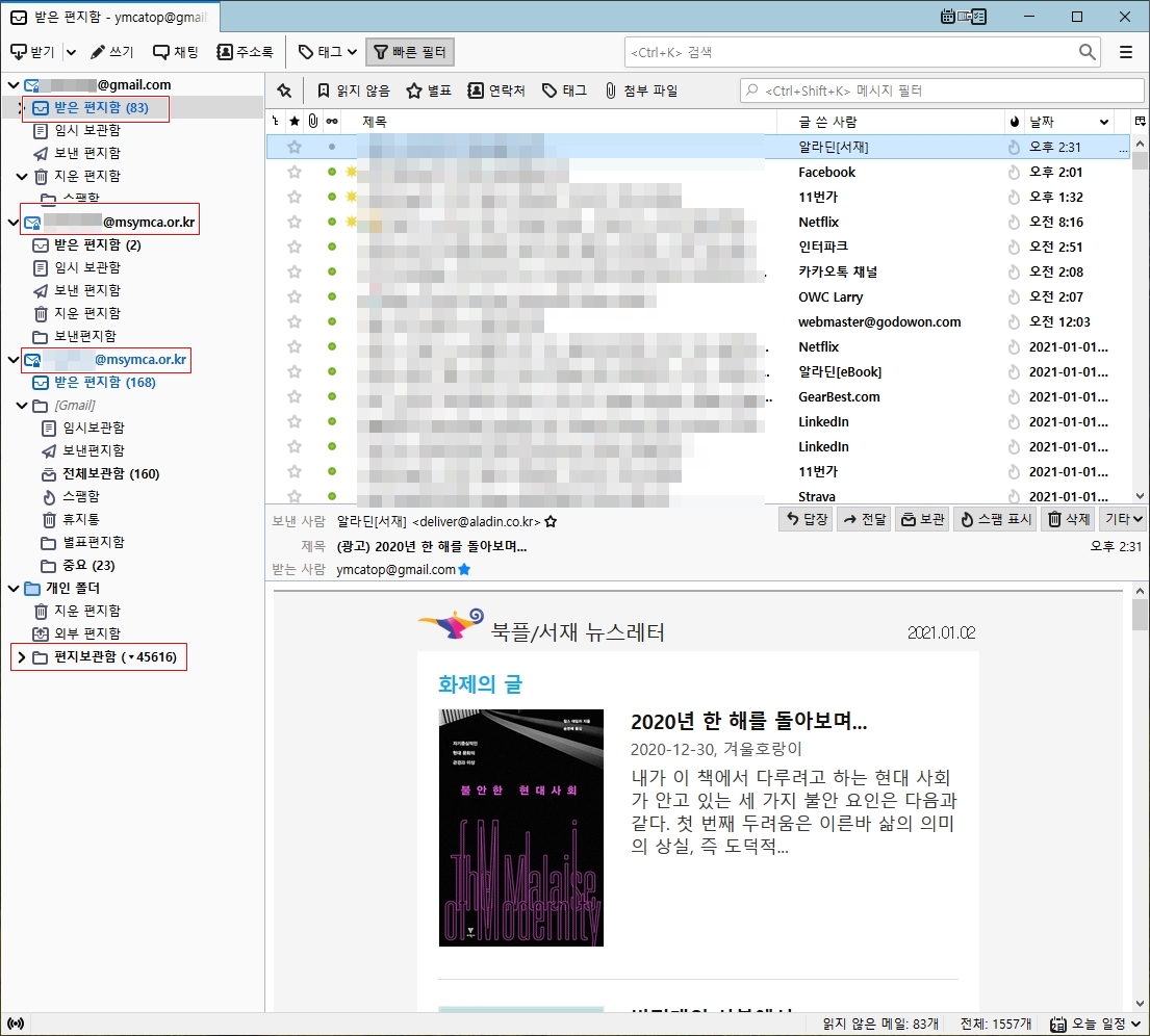 사실 카톡을 비롯하여 다양한 메신저가 등장하면서 E-mail 사용이 점점 줄어들고는 있는 것도 사실입니다. 5~6년 전만 하더라도 매년 저장하는 메일이 2000통이 넘었는데, 올해는 절반도 안 되는 것 같습니다. 하지만 아직도 메일로 주고 받아야 하는 내용들이 적지 않기 때문에 모질라 선더버드(Mozilla Thunderbird)를 활용해보시면 좋을 것 같습니다.