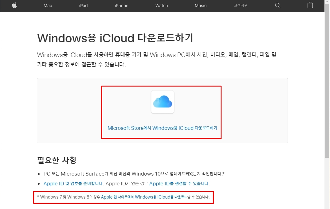 아무튼 모든 자료의 저장 폴더를 다 D 드라이브로 변경하였는데, 유일하게 말썽을 부리는 것이 아이클라우드 사진폴더였습니다. 윈도우10을 새로 설치한 후에 아이클라우드를 새로 설치하기 위해 인터넷을 검색했더니 아래 사진처럼 애플 사이트가 나왔습니다.