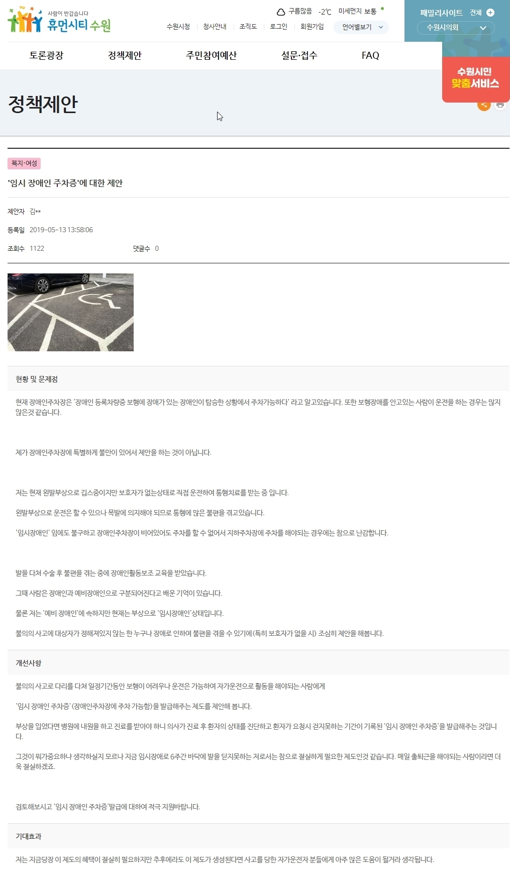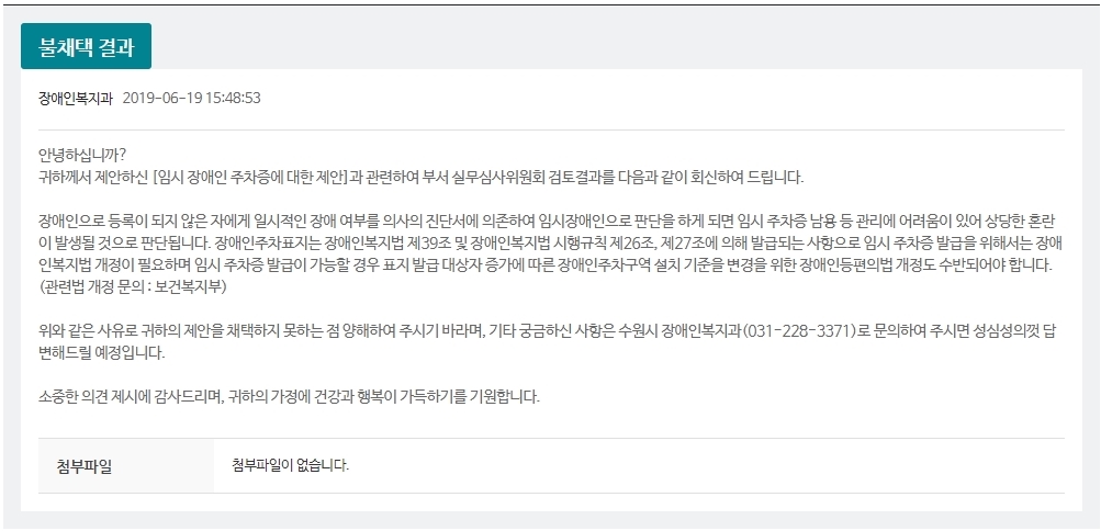 저의 경우 일시적이긴 하지만 거동이 불편한 장애인이 분명하였습니다만, ‘장애인 주차가능 스티커’가 없었기 때문에 현행 제도로는 장애인 주차구역에 차를 주차하면 과태료 10만원을 내도록 되어 있었습니다.