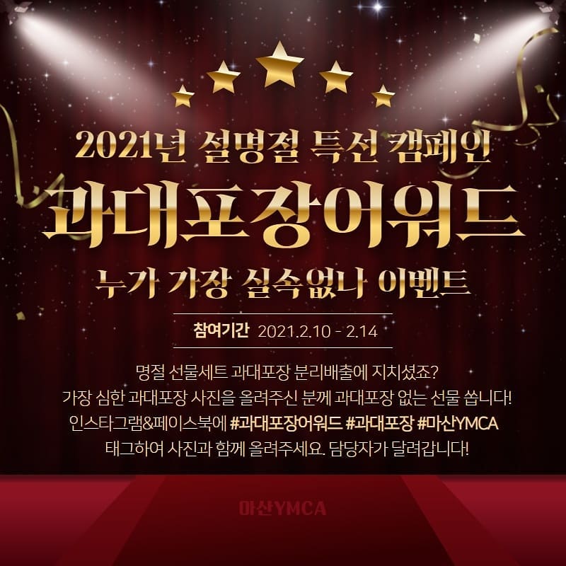 이 캠페인은 과대포장에 대한 소비자들의 인식 개선을 위해 페이스북과 인스타그램을 통해 설날 선물세트 ‘과대포장 고발 어워드’라는 이름으로 진행하였고, 많은YMCA 회원들과 시민들이 참여해주셨습니다. .
