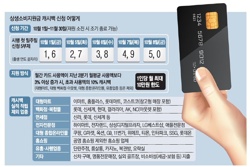 정부가 오늘 신용카드 캐시백 지급 방안을 정리하여 <상생소비지원금> 제도라고 이름을 붙여서 상세한 내용을 발표하였습니다. <상생소비지원금>을 받으려면, 2분기 월평균 카드 사용액과 비굥하여 3%이상 증가한 액수의 10%를 캐시백으로 환급해주겠다고 합니다. 예를 들면 2분기 월평균 카드사용액이 100만원이었던 소비자가 8월에 153만원을 쓰면 5만원을 캐시백으로 받을 수 있다고 합니다. 월 최대 10만원까지 받을 수 있는 캐시백을 모두 받으려면 8월, 9월, 10월에 매달 203만원을 신용카드로 지출해야 합니다. 2분기 평균 지출액이 2백만원이었다면 매달 406만원을 지출해야 되는겁니다.(6월 언론보도)