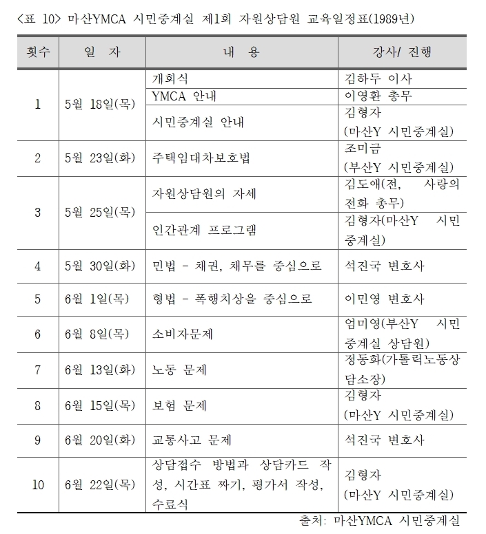 마산YMCA가 시민중계실 개소를 준비하면서 가장 먼저 시작한 활동은 자원상담원 공개모집과 교육이었는데, 제1회 자원상담원 교육은 <표 10>의 내용으로 1989년 5월 18일부터 6월 22일까지(매주 화, 목) 총 10강좌로 개최되었다.