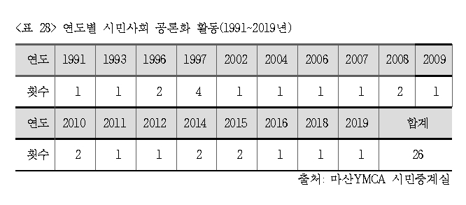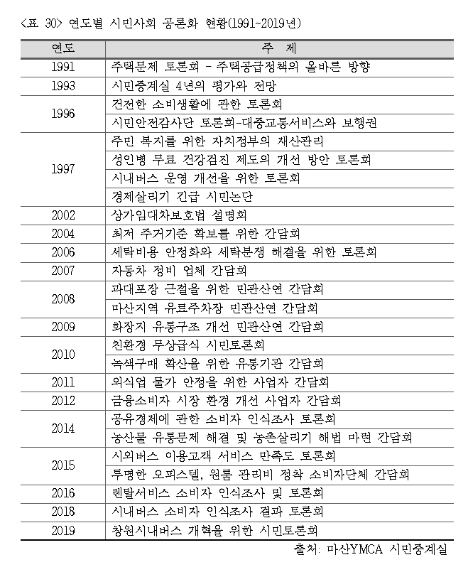연구 및 조사 활동은 대시민 캠페인으로 이어지거나 토론회, 간담회를 통해서 정부나 사업자들을 압박하고 설득하며 정책 변화를 촉구하는 노력으로 이어졌다. 마산YMCA 시민중계실은 30년간 총 26회의 토론회, 간담회, 설명회를 개최하였는데, 1997년 한 해 동안 4회를 개최하였고, 1996년, 2008년, 2010년, 2014년, 2015년에는 매년 2회씩 개최하였다(<표 28>).