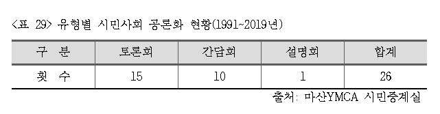 연구 및 조사 활동은 대시민 캠페인으로 이어지거나 토론회, 간담회를 통해서 정부나 사업자들을 압박하고 설득하며 정책 변화를 촉구하는 노력으로 이어졌다. 마산YMCA 시민중계실은 30년간 총 26회의 토론회, 간담회, 설명회를 개최하였는데, 1997년 한 해 동안 4회를 개최하였고, 1996년, 2008년, 2010년, 2014년, 2015년에는 매년 2회씩 개최하였다(<표 28>).