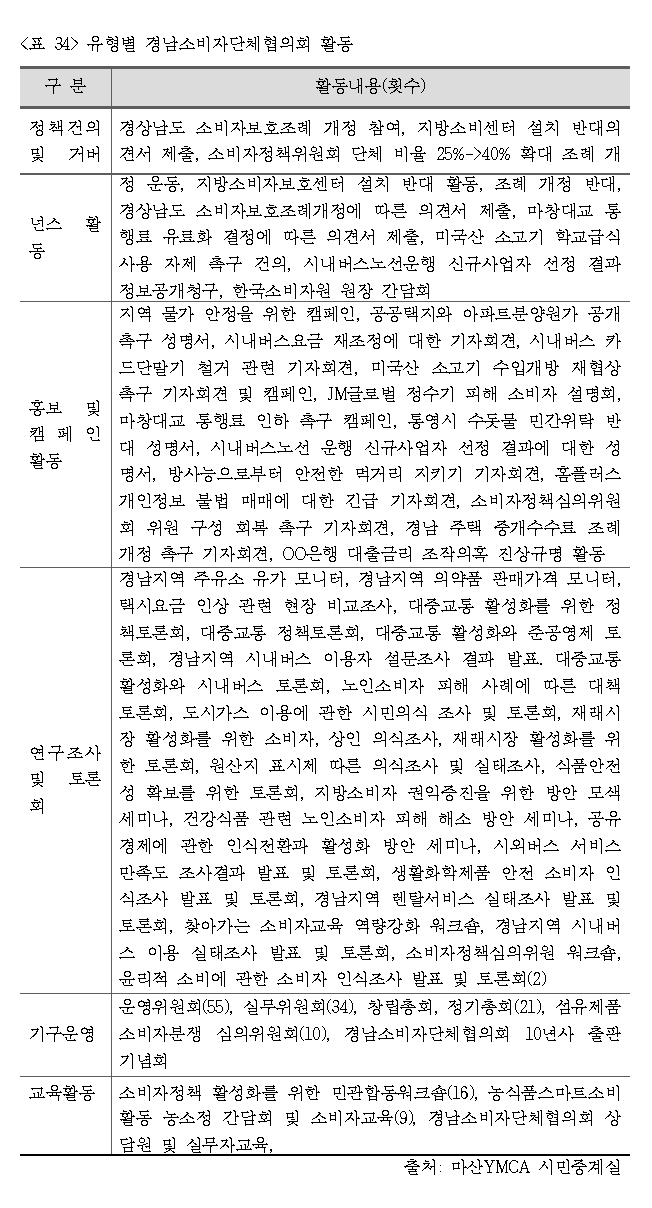 마산YMCA 시민중계실의 유형별 경남소비자단체협의회 활동을 살펴보면 <표 34>에 제시한 것과 같이 정책건의 및 거버넌스 활동, 홍보 및 캠페인 활동, 연구조사 및 토론회, 기구운영, 교육활동으로 구분할 수 있다.