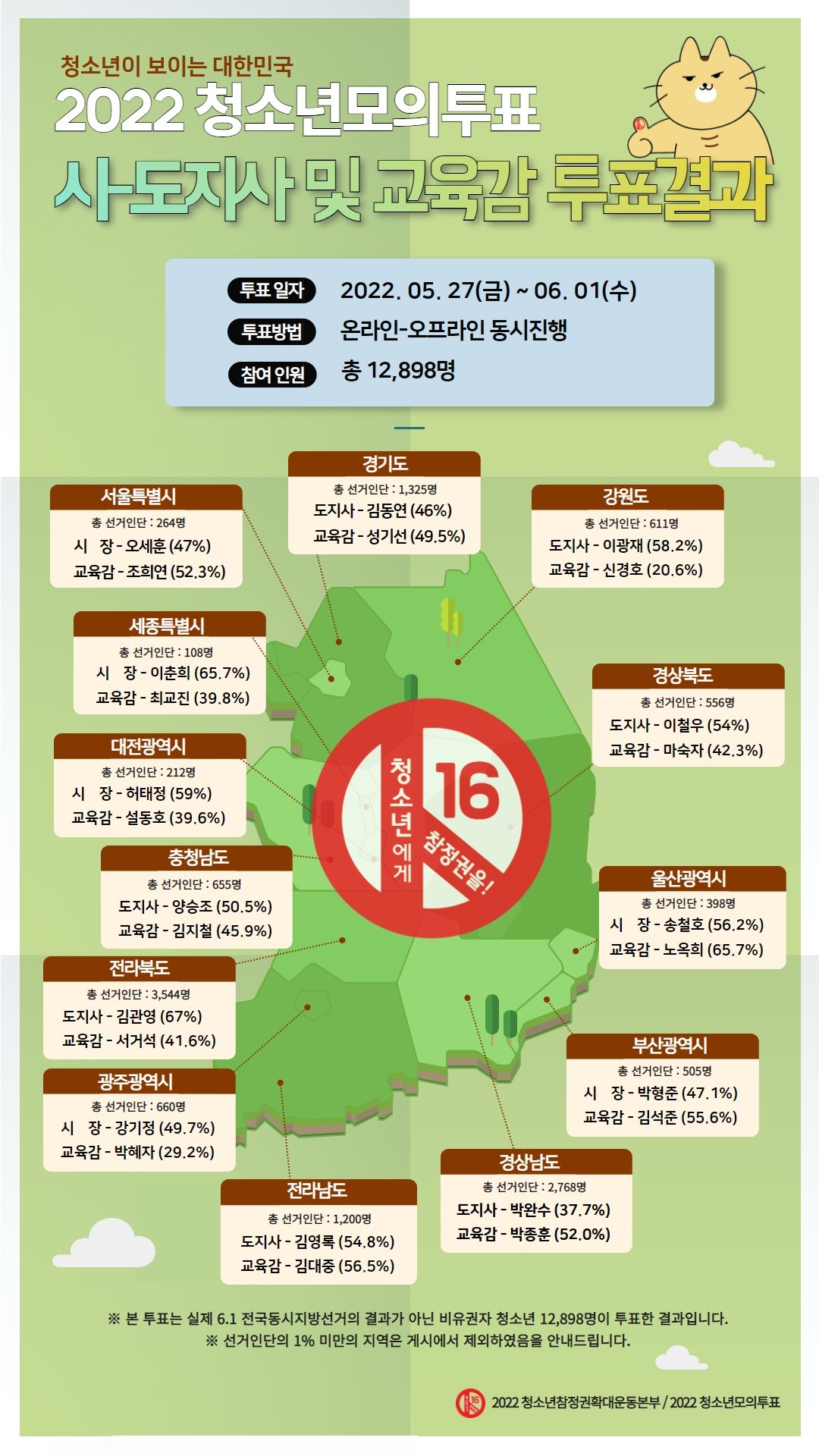 한편, 청소년이 뽑은 교육감 선거에서는 박종훈 후보가 51.6%로 1위, 김선유 후보가 17.8%로 2위, 이효환 후보가 17.1%로 3위, 박성호 후보가 11.9%로 4위를 차지하였습니다. 이 투표 결과도 실제 투표결과와 상당한 차이를 보였는데요. 실제 투표 결과는 박종후 후보가 48.8%를 얻어 1위를 차지하였고, 박성호 후보가 23.7%로 2위를 차지하였답니다.