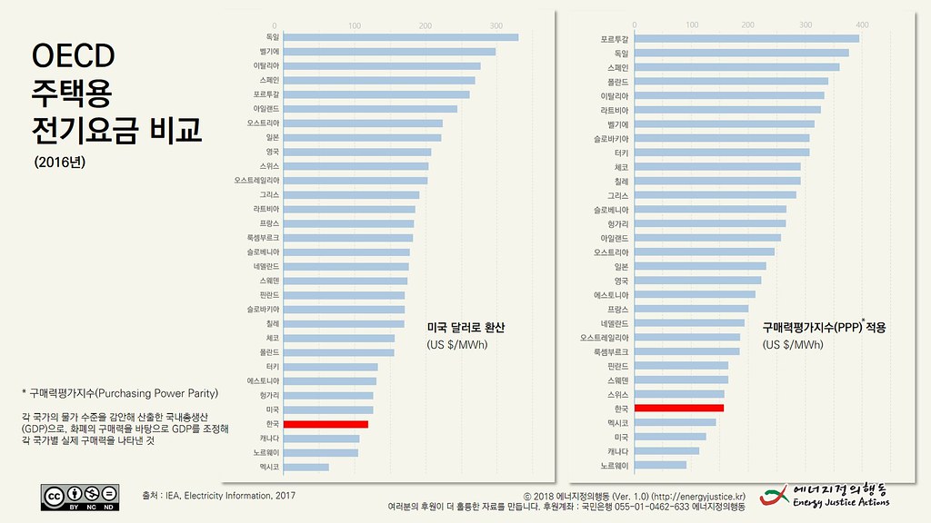 2021년을 기준으로 우리나라 전기요금은 가정용의 경우 OECD 전기요금 평균은 170원의 60%에 불과하고, 산업용의 경우는 OECD 평균 전기요금의 94%에 불과합니다. 산업용 전기요금도 OECD국가 절반이상이 우리나라보다 비싼 요금을 부담하고 있습니다. 심지어 우리나라 전기요금은 OECD국가 뿐만 아니라 중국, 필리핀, 태국을 비롯한 아시아 국가 중에서도 가장 싸다고 합니다.