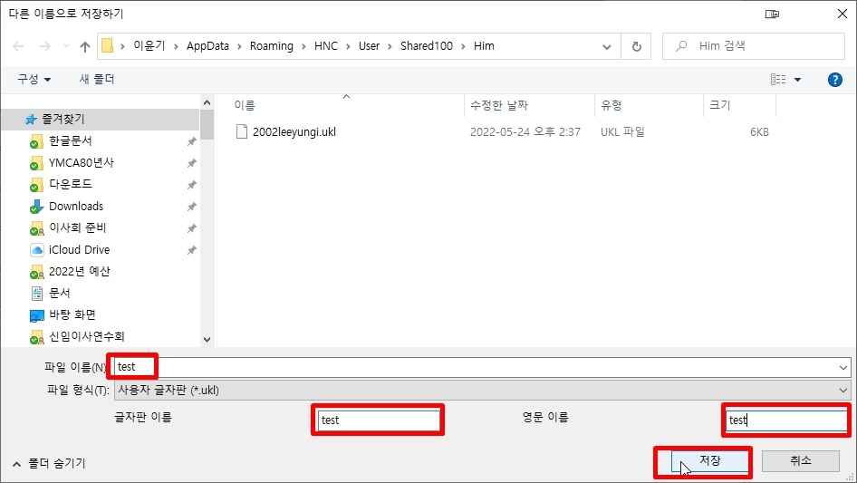 저는 임시로 <test>라고 저장하였습니다. 자판이름, 영문 이름 모두 똑같이 해주고 <저장>하였습니다.