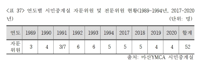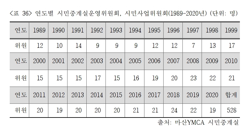 시민중계실운영위원회는 각계 전문가와 자원봉사자로 구성된 운영조직이었다. 1989년 총 12명의 위원으로 출발하여 2020년까지 총 528명이 시민중계실 활동의 조력자로 참가하였고(<표 36>), 이는 매년 평균 16.5명이 운영위원으로 참여한 것이다. 1989년 구성된 첫 시민중계실운영위원회는 당시 사업가였던 안승엽 위원이 초대 위원장을 맡아 3년 동안 활동하면서 마산YMCA 소비자운동이 지역사회에 뿌리내릴 수 있도록 크게 기여하였다. 시민중계실 위원들은 직업군별로 나눠보면 사업가 8명, 사회운동가 2명, 언론인, 문화활동가 등이 참여하였으며, 자문위원회에는 변호사 2명, 법학과 교수 1명이 활동하였다.