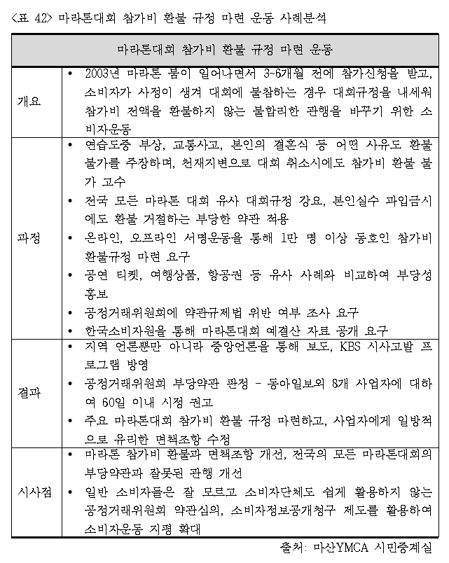당시 마산YMCA 시민중계실에서는 대회 30일 전까지는 전액 환불 또는 참가자 교체, 대회 20일 전까지는 10% 공제 후 환불 또는 참가자 교체, 대회 물품 택배 발송 전(15일 전)까지는 20% 공제 후 환불 또는 참가자 교체, 대회 물품 택배 발송 후(14일 전)부터는 환불 불가라는 환불규정을 제안하였다. 국내 메이저 마라톤대회를 주최하는 OO일보사 마라톤, OO일보 서울국제마라톤, OO일보 통일마라톤 등 국내 메이저 대회부터 참가비 환불규정과 대회 면책조항을 수정하게 되었으며, 지방자치단체가 주최하는 대부분의 마라톤 대회도 환불 규정을 만들어 적용하게 되었다. 일반 소비자들이 잘 모르는 공정거래위원회의 부당약관 심의 제도와 한국소비자원의 소비자정보공개청구 제도를 활용하여 지역 민간 소비자단체의 소비자운동 영역과 역할을 확장하고 지평을 넓혔다는데 중요한 시사점이 있다(<표 42>).