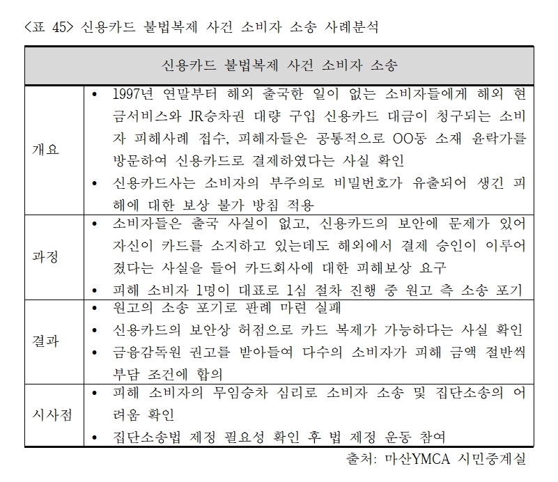 마산YMCA 시민중계실에서는 피해사례를 알리는 보도자료를 내고, 언론보도를 통해 추가 피해 접수를 받아 적극적인 피해구제에 나섰다. 아울러 시민중계실운영위원회를 통해 소비자 집단소송을 통해 피해구제에 나섰지만, 신분 노출 때문에 소송 참가 희망자가 많지 않은 상황에서 어렵게 1명을 확보하였다. 그러나 마산YMCA와 함께 소송을 진행하던 원고 역시 1심 재판이 진행되는 과정에서 개인 사정으로 소송을 중단하고 신용카드사와 합의하였고, 더이상 신용카드 회사를 상대로 소송을 해보겠다는 피해자를 찾을 수 없어 소송을 중단하였다. 이 사건을 계기로 마산YMCA 시민중계실은 소비자 집단소송의 필요성을 깨닫고 집단소송법 제정을 위한 소비자단체 실무자 및 상담원 워크숍을 개최하는 등 관련 법 제정 운동을 펼치게 되었다(<표 45>).