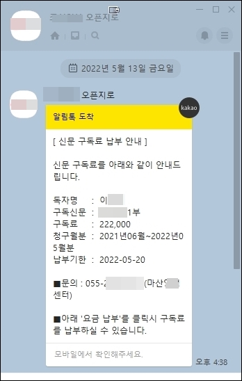 신문을 투입하는 보급소와 상대하는 것이 더 어렵고 복잡한 일이라서 H신문사에 신문투입 중단을 요청하였지만 이후 1년 8개월 동안 신문은 계속투입되었습니다. 그러다가 지난 5월 어느날 C일보 창원시 마산회원구 보급소에서 카톡으로 온라인 지로 청구서가 왔습니다. 밀린 신문대금 222,000원을 납부하라는 지로였는데, 마침 보급소 연락 전화번호가 적혀 있더군요.