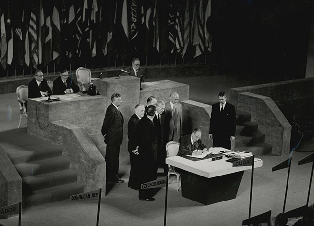1951년에 체결된 샌프란시스코평화조약은 1945년 6월 26일에 채택된 국제연합헌장 및 10월 24일부터 활동을 시작한 국제연합을 바탕으로 체결되었다. 27개조로 구성된 샌프란시스코평화조약 전문에는 “일본국으로서는 국제연합에 대한 가맹을 신청하고 또 어떤 상황이라도 국제연합헌장의 원칙을 준수”한다고 되어 있다. 또 전문에는 국제연합헌장 제55조와 제56조에 따른 의사를 선언한다고 규정되었다. 즉, 샌프란시스코평화조약은 1951년에 체결되었지만, 제2차 세계대전 중에 채택된 국제연합헌장이 반영되었고, 일본의 제국주의적 지향성을 규정했다(김숭배, 2017). 1951년 초 대일평화조약을 주도한 미국 국무성고문 존 포스터 덜레스였다. 그는 점령된 국가의 수도 도쿄나 일본이 공격했던 하와이에서의 조약체결은 화해의 조약으로 적절치 않다고 보았다. 강력한 반공주의자였던 덜레스는 중국이 공산화된 후 일본을 중요하게 생각하였고, 대일평화조약이 ‘화해의 강화’가 되어야 한다고 보았다. 그가 선택한 샌프란시스코는 일본인 이민 역사가 있는 장소이며, 1945년 국제연합헌장이 채택된 장소라는 상징성을 가진 곳이었다. 대일 평화조약 체결을 위한 회의는 1951년 9월 4일부터 8일까지 샌프란시스코에서 개최되었다(김숭배, 2017).