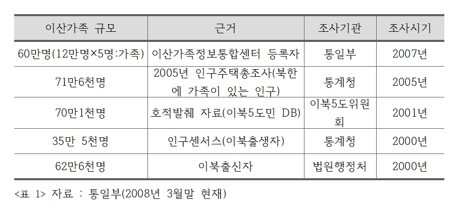 국방부 정훈국에서 편찬한 『한국전란2년지』에는 경기 이북, 강원 이북, 황해, 평남, 평북, 함남, 함북에서 남쪽으로 피난한 월남민을 62만여 명으로 추정하고 있다. 월남민에 대한 정확한 통계는 없지만, 정부가 집계를 시작한 1988년 이후부터 2017년까지 북한에 거주하는 가족을 만나기 위해 이산가족으로 신청한 사람은 13만 1,166명이다(한성훈 2017). 2007년을 기준으로 통일부가 이산가족정보통합센터를 통해 관리하는 이산가족 규모는 약 60만명(12만명x5명), 통계청이 2005년 인구주택총종사에서 북한에 가족이 있는 인구를 조사한 현황은 71만 6천명, 이북5도위원회가 호적 발췌자료를 근거로 추산하는 이산가족 규모는 70만 1천명, 2000년 통계청 인구센서스에서 조사한 이북 출생자는 35만 5천명, 법원행정처가 2000년에 조사한 이북출신자는 62만 6천명이다.