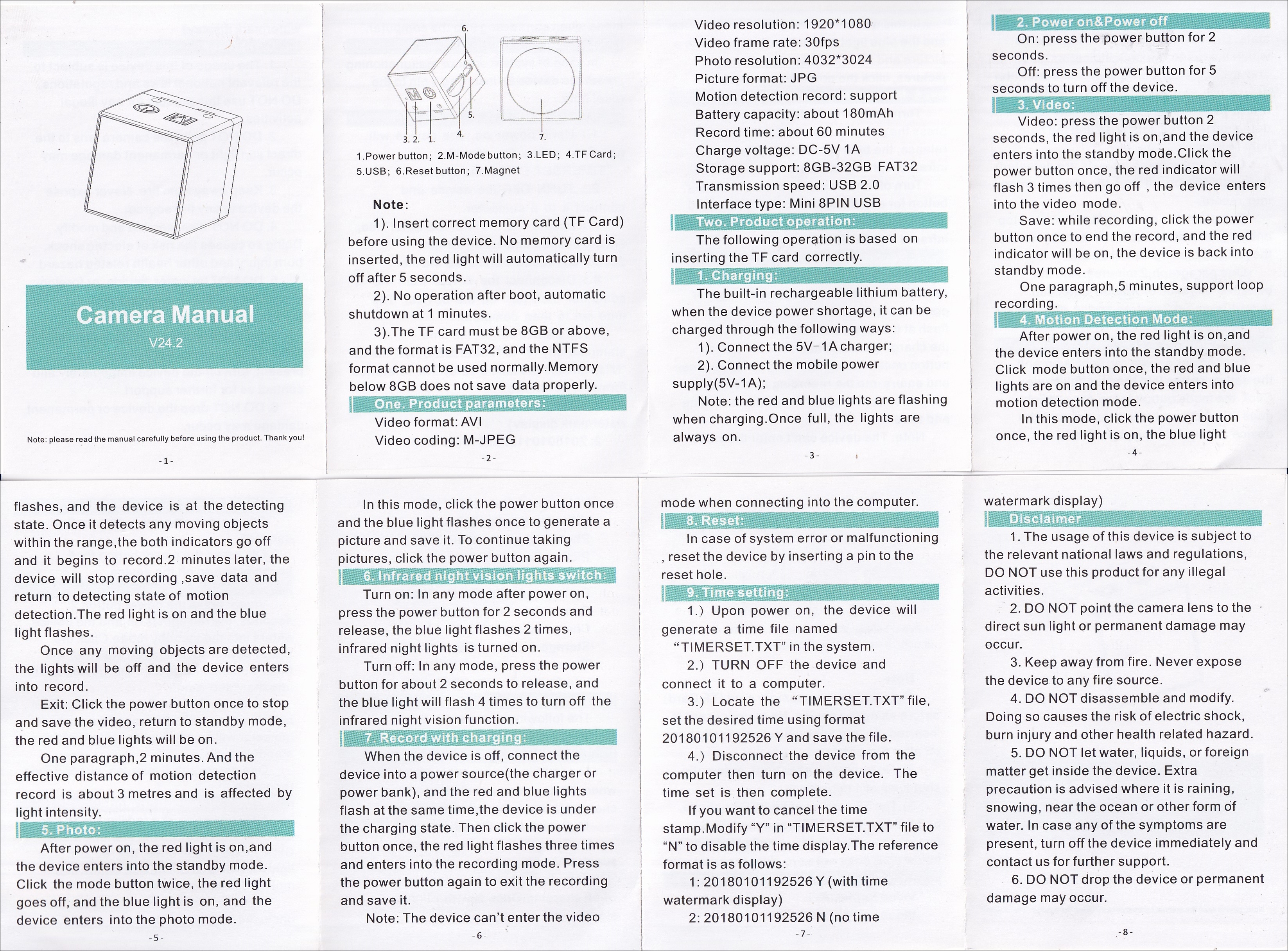 1. 전원 버튼; 2.M 모드 버튼; 3. LED; 4.TF 카드; 5. USB; 6. 리셋 버튼; 7 자석