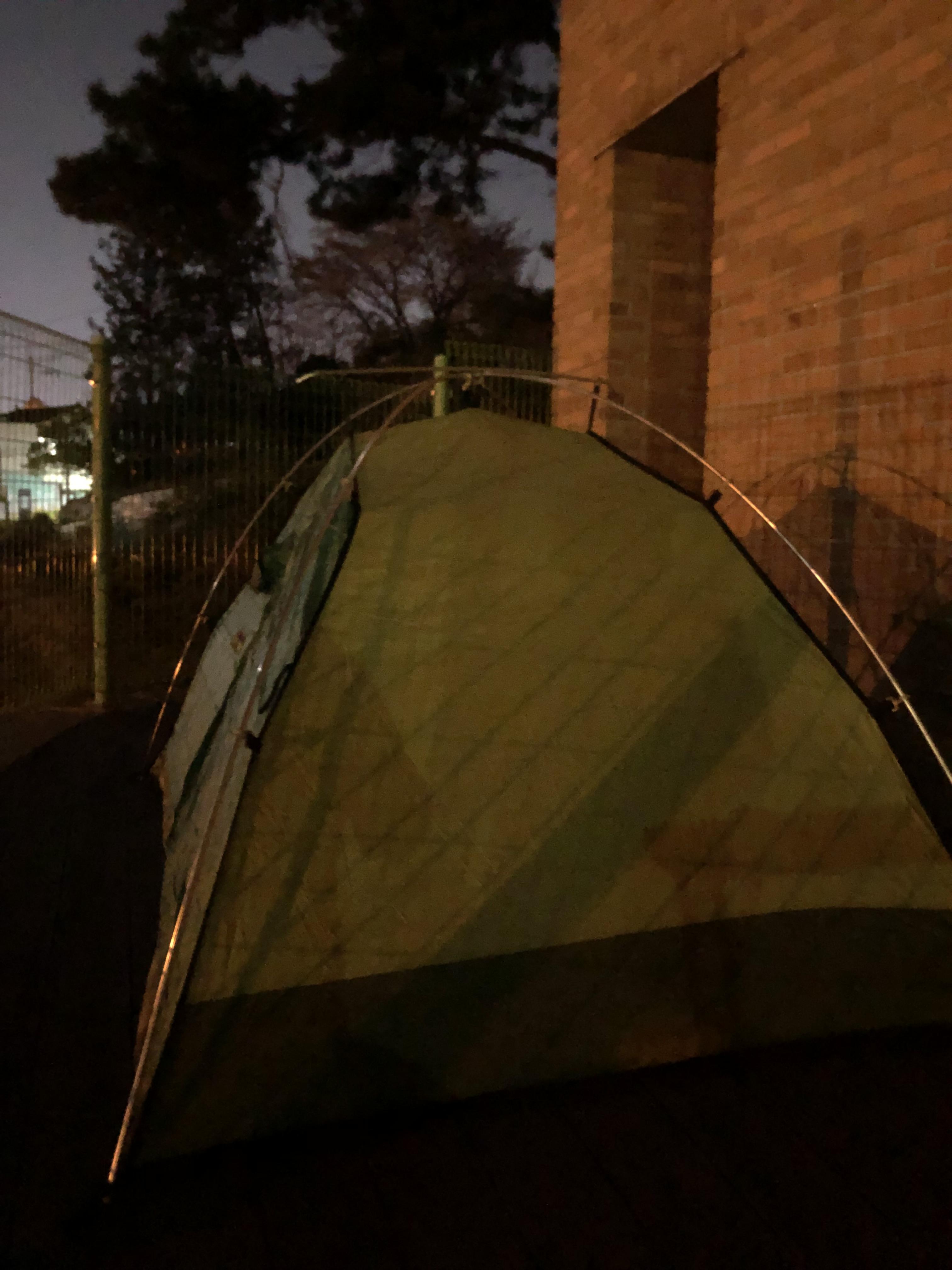낮기온이 많이 올랐던 날이지만, 밤에는 기온이 내려가는게 느껴져서 낡은 플라이라도 설치를 하였습니다. 백패킹을 주로 데크가 있는 곳에서 할 생각이라서 오징어팩이 필요하겠다는 것을 확인하였습니다. (나중에 텐트에 누워서 주문했습니다.) 이 날은 바람이 불지 않았기 때문에 주변 철조망과 앙카볼트가 있는 벽에 대충 묶어 두었지만 밤새 잘 견뎠습니다.