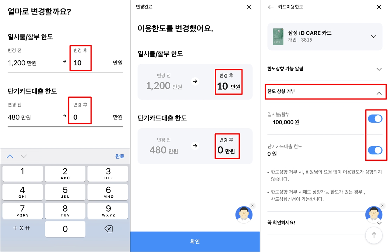 그래서 저는 S 카드사 앱에서 이용한도를 낮추고 '한도 상향 거부'에 체크를 해두었습니다. 이렇게 해두면 카드 회사가 마음대로 한도를 상향시킬 수 없기 때문입니다.