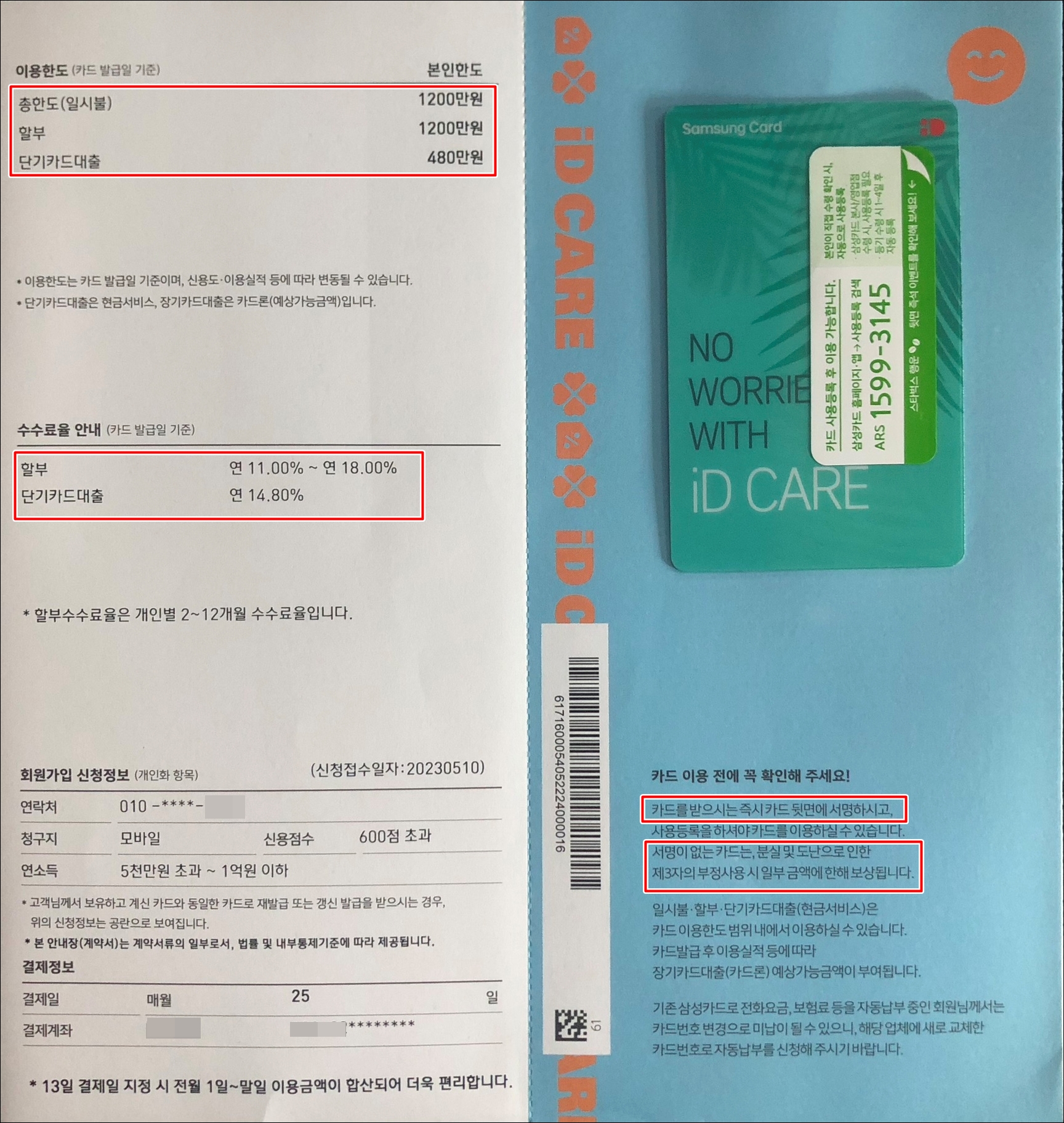 두 번째는 이용한도를 보고 깜짝 놀랐습니다. 처음 발급되어 온 신용카드 이용한도는 무려 1200만원이었습니다. 일시불 한도 1200만원, 할부한도 1200만원, 단기 카드대출 한도는 480만원이었습니다. 뭣 때문에 제 지갑 속에 1200만원짜리 카드를 들고다녀야 할까요?