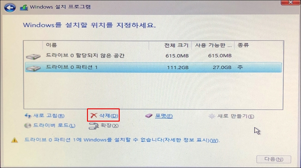 저의 경우 윈도우 설치 단계에서는 오류 없이 파티션이 깨끗하게 삭제되었습니다.