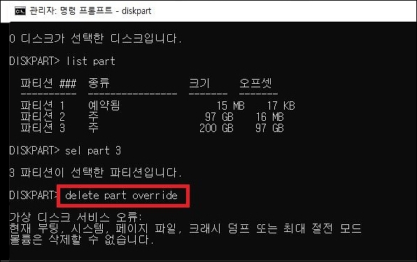 <DISKPART>를 실행하여 del part override를 입력해도 파티션 삭제가 되지 않고, "가상 디스크 서비스 오류: 현재 부팅, 시스템 페이지 파일, 크래시 덤프 또는 최대 절전 모드 볼륨은 삭제할 수 없습니다."라는 오류가 반복됩니다.