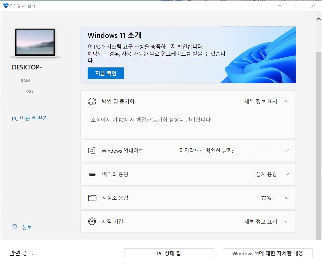컴퓨터에 윈도우10을 재설치(GPT)하고    WindowsPCHealthCheckSetup.msi 프로그램을 실행하여, 윈도우 11 설치가 가능한지 확인을 해보았습니다.