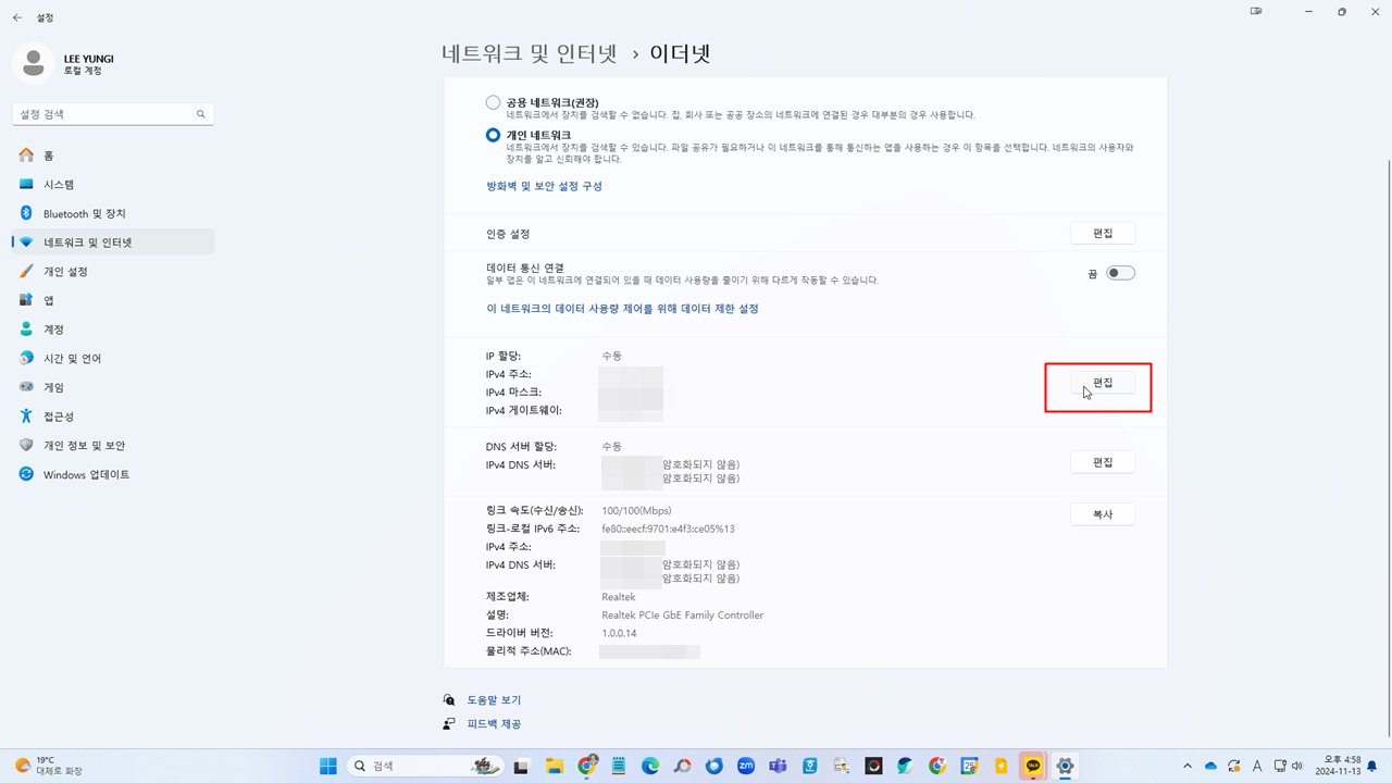 3. 다음 화면이 나오면 IP 할당 <편집>을 클릭 합니다.