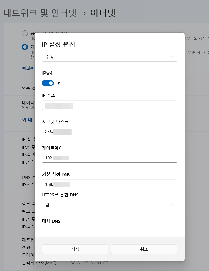 4. 아래와 같이 새창이 열리면 <수동>으로 변경하고 고정 IP를 할당해줍니다. (각 실무자 컴퓨터의 고정 IP는 구글 클라우드에 저장해 두었습니다.