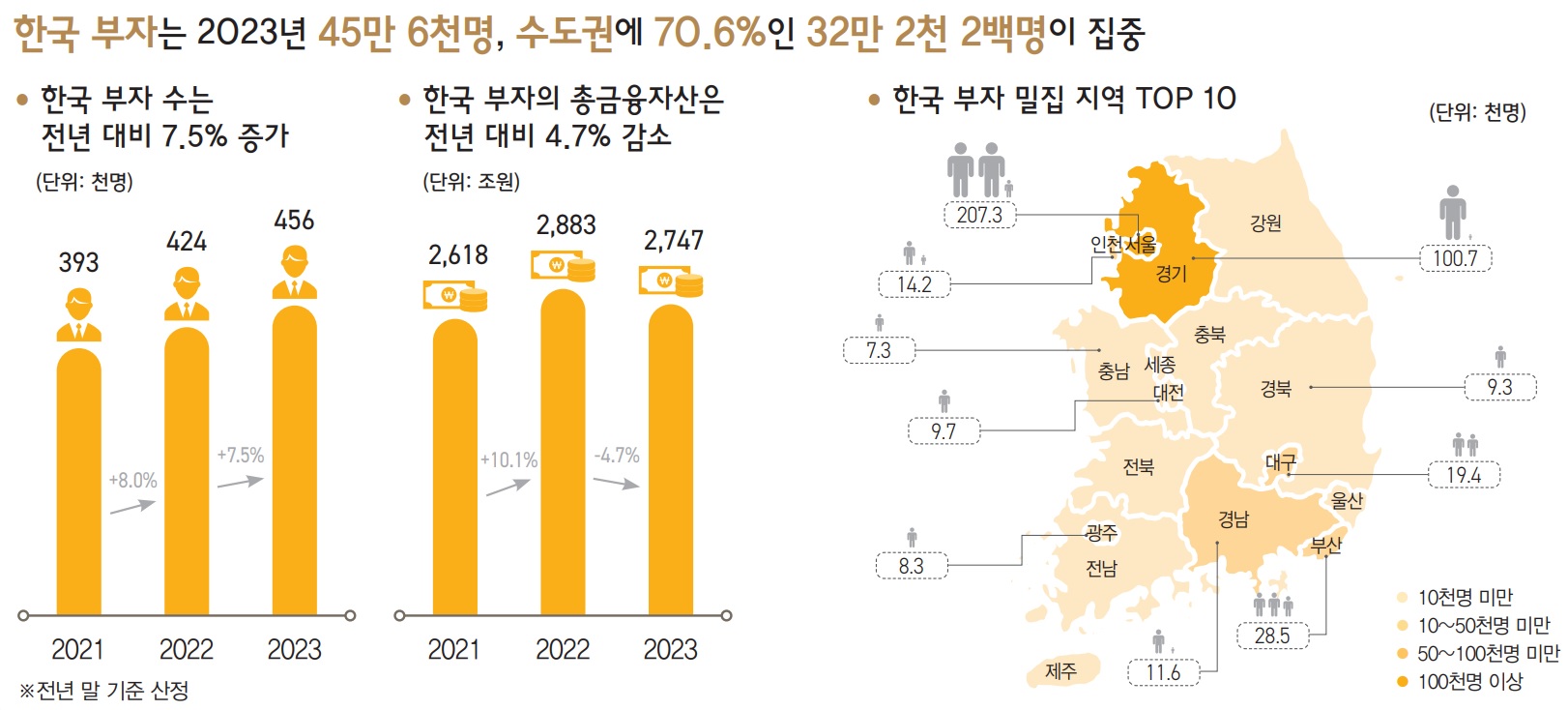 그런데 부자들은 금융자산 못지 않게 많은 부동산 자산도 보유하고 있는데요. 부자들이 보유한 총 부동산 자산은 2543조원으로 2022년 대비 7.7%가 증가하였다고 합니다. 한편, 또한 부자의 70.6%(약 31만 명)는 서울과 수도권에 살고 있고, 경남에 살고 있는 부자는 약 500명에 불과합니다.