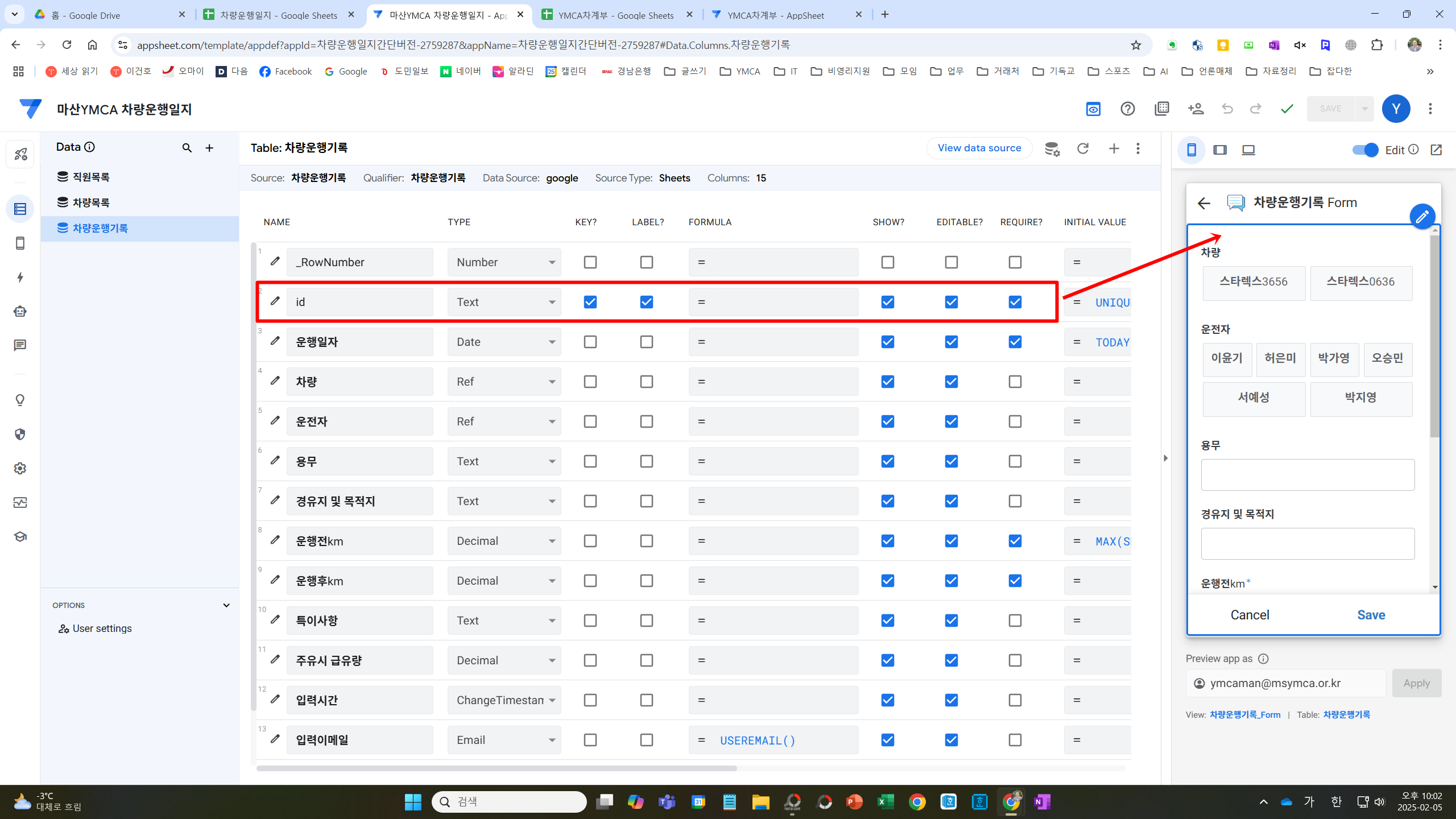 두 번째 방법은 view의 <차량운행기록_Form> - Column order를 Manual에서 id를 제거합니다.