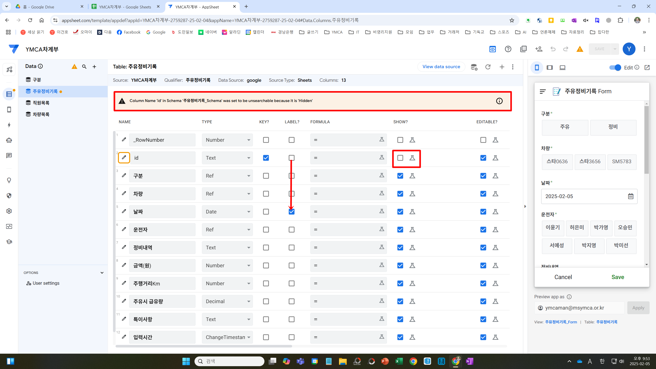 아래 예시는 id가 앱시트에 표시되지 않게 하는 방법입니다.