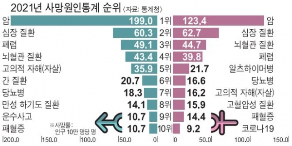 그런데, 올해는 더 심각한 통계자료가 나왔습니다. 통계청이 발표한 2023년 사망원인 통계에 따르면, 경남은 인구 10만명당 암 사망률이 86명으로 전국 시, 도 중에서 1위를 차지하였고, 뇌혈관 질환 사망도 10만명당 23.2명으로 전국 1위를 차지하였습니다. 아울러 심장질환 발생도 울산, 부산, 강원에 이어 근소한 차이로 4위를 차지하였는데, 10만명당 30.9명이 사망한 것으로 확인되었습니다. 그 밖에도 알츠하이머 사망률과 당뇨병 사망률도 전국에서 가장 높다고 합니다.