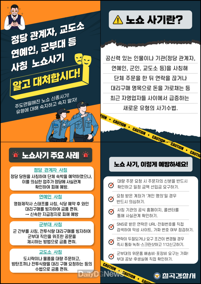 최근 경남 지역에는 종교 단체를 사칭하는 노쇼 사기 피해가 여러 건 확인되고 있습니다. 범죄조직은 우산과 같은 기념품 구매로 소상공인을 유인하거나, 종교 시설에 방역소독이나 에어컨 청소 같은 용역을 의뢰한 후에 화장지를 비롯한 용품 구매나 소화기 같은 물품 구매까지 한꺼번에 납품 해달라고 요청한다는 것입니다. 종교단체 대표 명의로 <계좌이체 결제승인서>와 같은 공문을 보내 안심시킨 후에 추가 구매한 물품 경제까지 한꺼번에 지불하겠다는 제안을 한다는 것입니다. 피해가 확산되다보니 창원에 있는 여러 종교 시설 홈페이지에는 ‘노쇼 사기’에 속지 말 것을 알리는 팝업 글이 게시되어 있습니다.