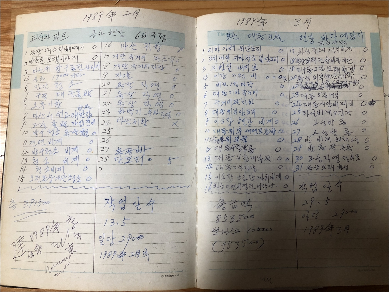 아버지가 자신의 삶을 기록으로 남긴 것은 일기와 같은 긴 글은 아닙니다. 아버지는 몇년 몇월 몇일 어느 공사장에서 무슨 작업을 하였는지를 빠짐 없이 기록하였습니다. 아버지가 매일매일의 작업 내역을 기록으로 남긴 까닭은 사실 단순합니다. 일당을 제대로 챙겨 받기 위한 것이었습니다.