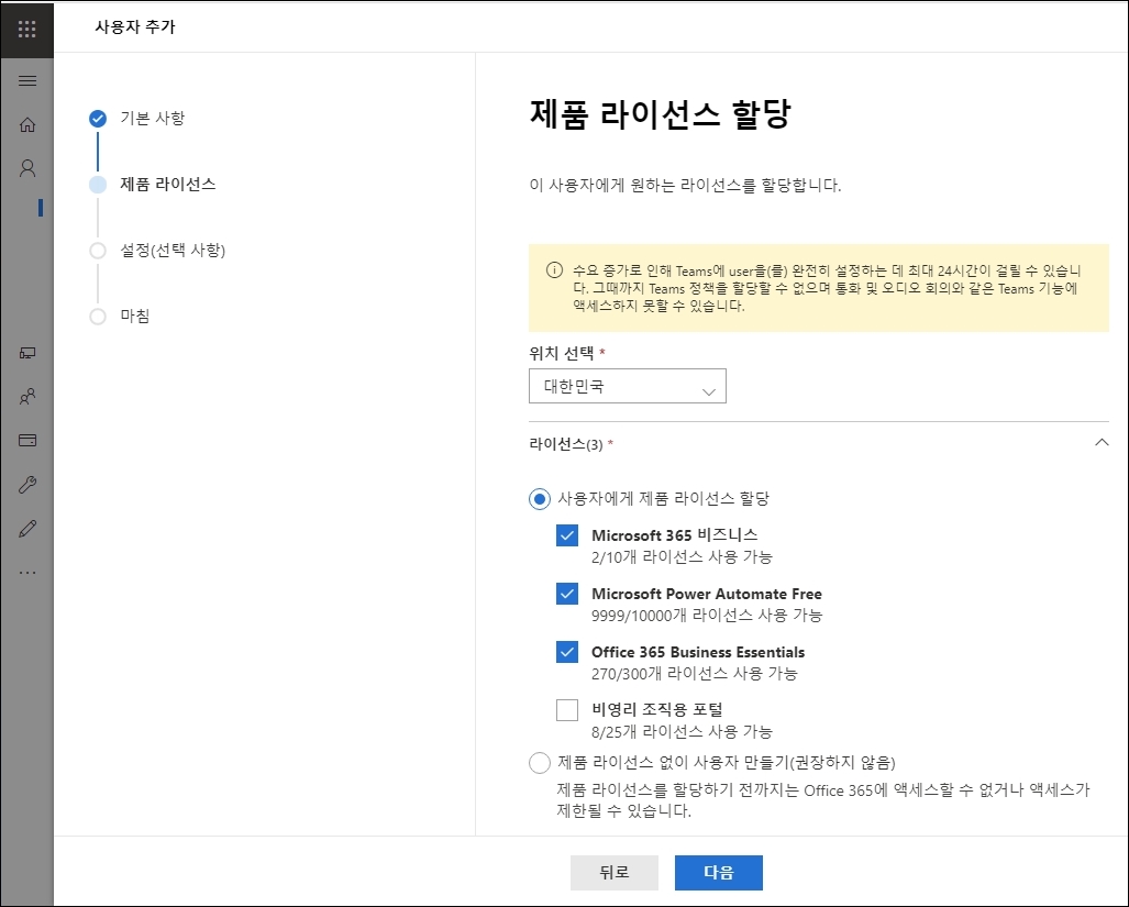 두 번째 단계는 라이센스 할당 입니다. 아직 구독신청이 되어 있지 않아서 라이센스 할 당에 MS 오피스 365나 오피스365 비즈니스 에센셜은 없을 것 입니다. <Microsoft Power Automate Free> 나 <비영리조직용 포터>만 신청하셔도 되고, 아니면 '제품 라이선스 없이 사용자 만들기'를 선택하셔도 됩니다. 라이센스 등록은 나중에 사용자(활동가) 별로 얼마든지 추가로 할 수 있습니다.