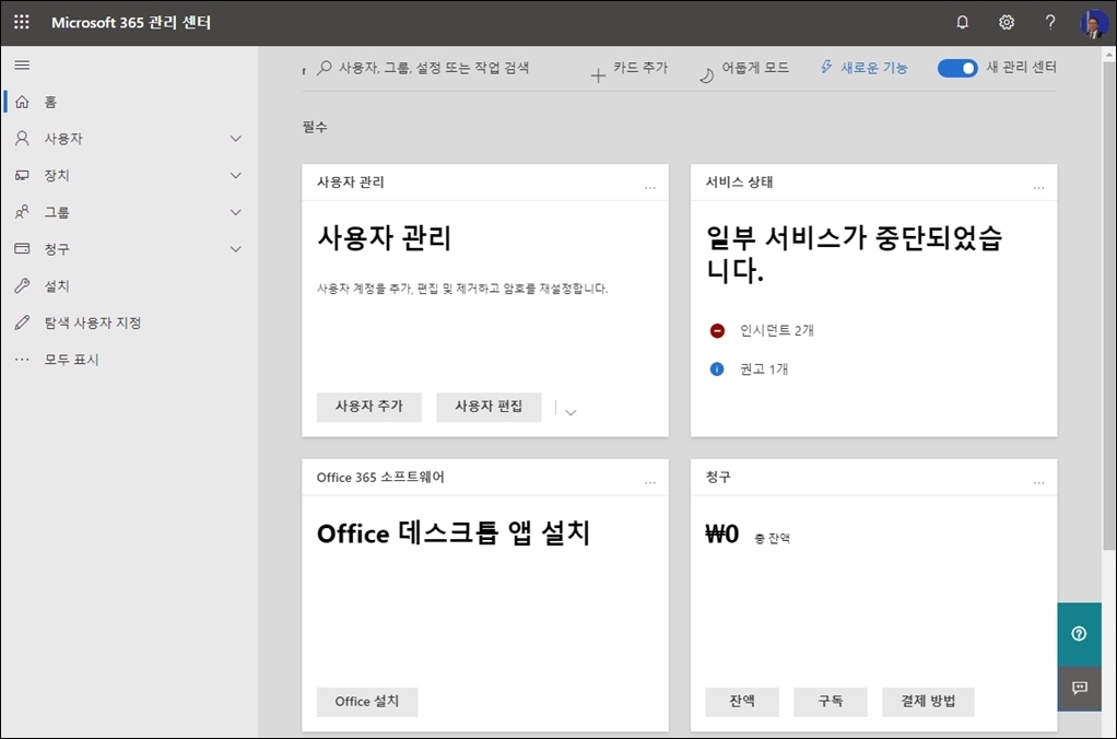 관리자를 위한 관리센터로 가기 위해서는 위쪽 사진 내계정 옆에 있는 타일 모양을 클릭하면 여러가지 오피스 앱과 함께 맨 아래쪽에 <관리>라는 앱이 있습니다. 여기를 클릭 하시면 아래 사진과 같은 관리자 메뉴로 이동합니다.