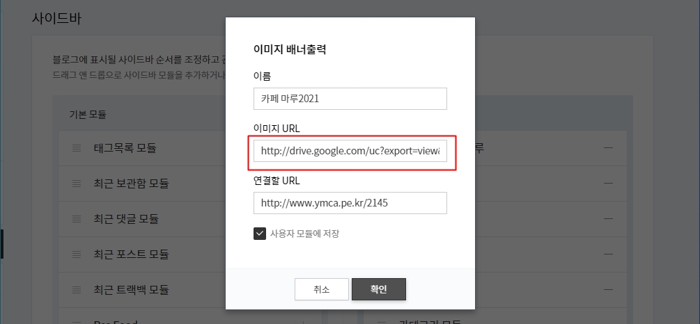 티스토리 <이미지 URL>에 붙여넣기를 하고 <확인>을 눌러서 저장하면 맨 위 첫 번째 사진처럼 티스토리 사이드바에 사진(혹은 광고)를 넣을 수 있습니다.