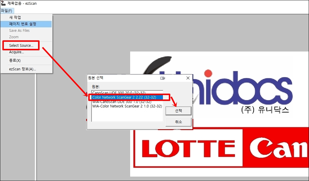 다음은 소스 설정입니다. Select Source를 눌러서 Color Network ScanGear2 2.22 가 선택되어 있는지 확인하시고 '선택'을 누르시면 됩니다. 기본 설정이 다르게 되어 있으면 Color Network ScanGear2 2.22 선택하시면 됩니다.