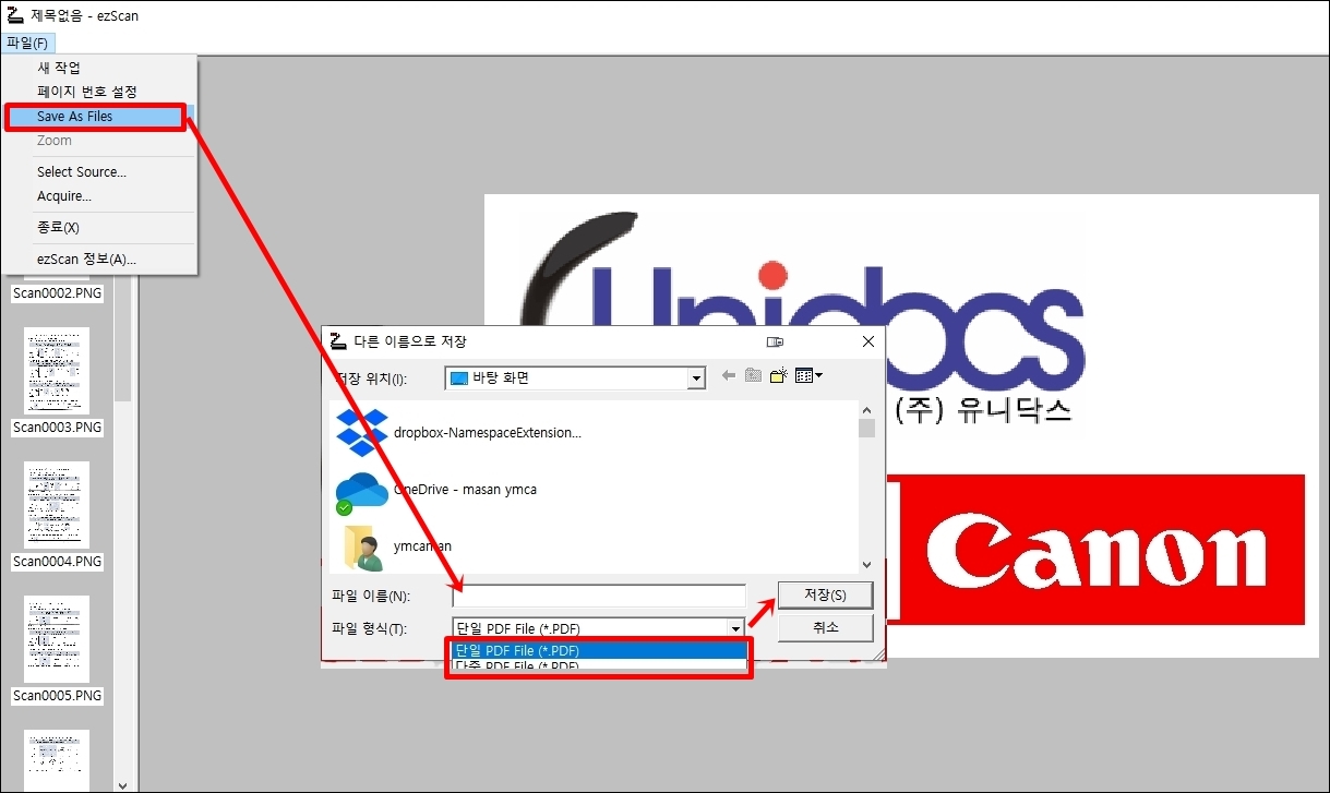 여기서 스캔 받은 여러 장의 파일을 1개의 PDF 파일로 저장하려면 <단일 PDF 파일>을 선택하시고, 각 페이지 별로 PDF 파일로 저장 하시려면 <다중 PDF 파일>을 선택한 후에 저장하시면 됩니다.