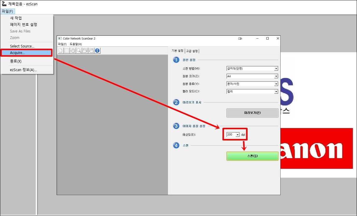 이제 본격적으로 스캔을 시작합니다.  Acquire를 누르시면 스캔 화면이 열립니다. 다른 설정은 그대로 두시고 해상도만 필요한대로 수정하시면 됩니다. 저는 300dpi로 설정해서 사용합니다. '스캔'을 누르시면 스캔이 시작되는데, 그 전에 복합기(복사기) 설정을 바꿔주셔야 합니다.