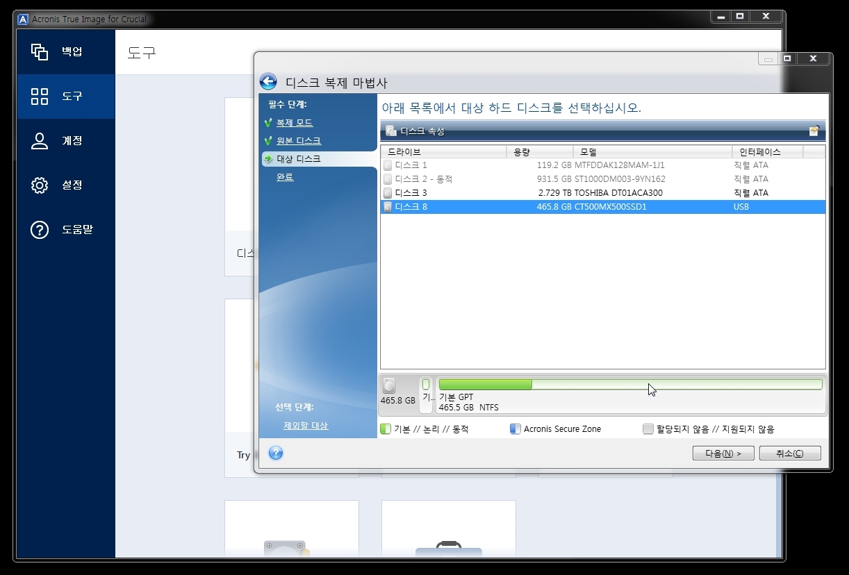 다음은 대상 디스크를 선택합니다. 원본 디스크 보다 더 신중하게 선택해야 합니다. 대상 디스크를 잘못 선택하면 대상 디스크의 자료가 몽땅 날아가게 될 수도 있기 때문입니다. 저는 USB로 연결된 8번 디스크가 새로 준비한 크루셜 SSD입니다. 마찬가지로 <디스크 관리> 화면을 함께 열어두고 디스크 번호를 정확히 확인하시는 것이 안전합니다.