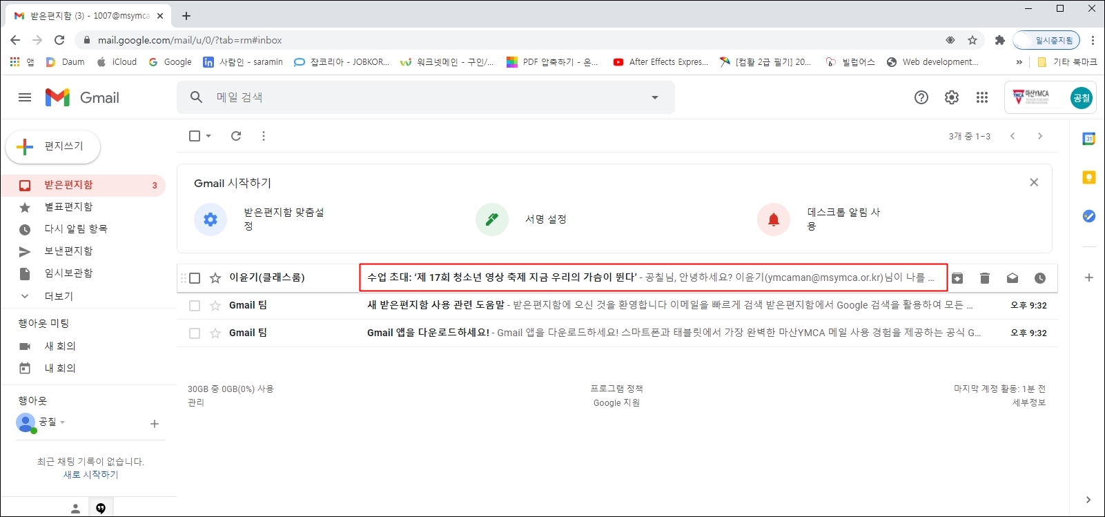 반드시 마산YMCA에서 발급한 계정 (○○○○○○@msymca.or.kr) 계정으로 로그인 해야 합니다 .