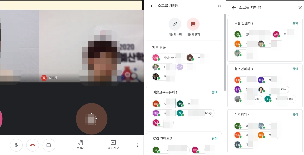 온라인 토론회를 할 때는 소그룹으로 나누어 조별 토론을 하는 경우가 많습니다. 이 때 소그룹 채팅방 설정 권한을 누가 가지고 있느냐가 중요합니다. 회의 주최자는 소그룹 채팅방을 만들고 구성원들을 각각의 채팅방에 배정할 수 있는 절대적 권한을 가지게 됩니다. 따라서 이런 역할을 해야하는 교사B가 교사A 보다 늦게 구글 미트에 접속하는 경우 Zoom처럼 권한을 위임 받는 기능이 없어 아주 불편합니다.