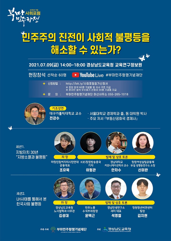 오늘은 지난 7월 9일 금요일에, 부마민주항쟁기념재단에서 개최한 사회포럼 이야기를 좀 해보려고 합니다. 부마항쟁 42주년을 기념하는 사회포럼, 올해는 민주주의 진전이 사회적 불평등을 해소할 수 있는가? 라는 주제로 개최되었는데요. 이날 토론회에서 이슈가 되었던 민주주의와 불평등 문제 그리고 지방소멸 문제에 대하여 함께 생각해보겠습니다.