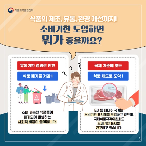소비자단체들은 오래 전부터 쓰레기를 줄이고 자원낭비를 막기 위해 소비기한 표시제 도입을 주장해 왔는데, 이제야 국회가 법을 개정하고 2023년부터 시행하게 된 것입니다. 이 제도를 즉시 시행하지 않고 유예기간을 둔 것은 갑작스런 제도 변화로 인한 소비자들의 혼란을 막기 위한 것입니다.